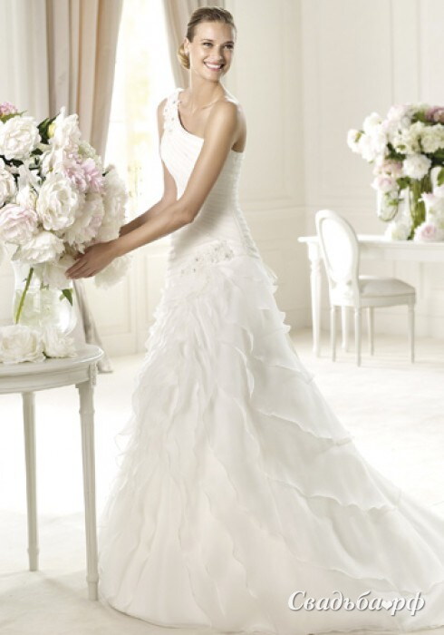 Платье на ленточной шнуровке с одним плечем (удобно для корректировки размера) и вертикальным воланом, переходящим в шлйлеф, очень стройнит фигуру, Эта модель также подойдет и для невесты в первой половине беременности ( до 6 мес.)