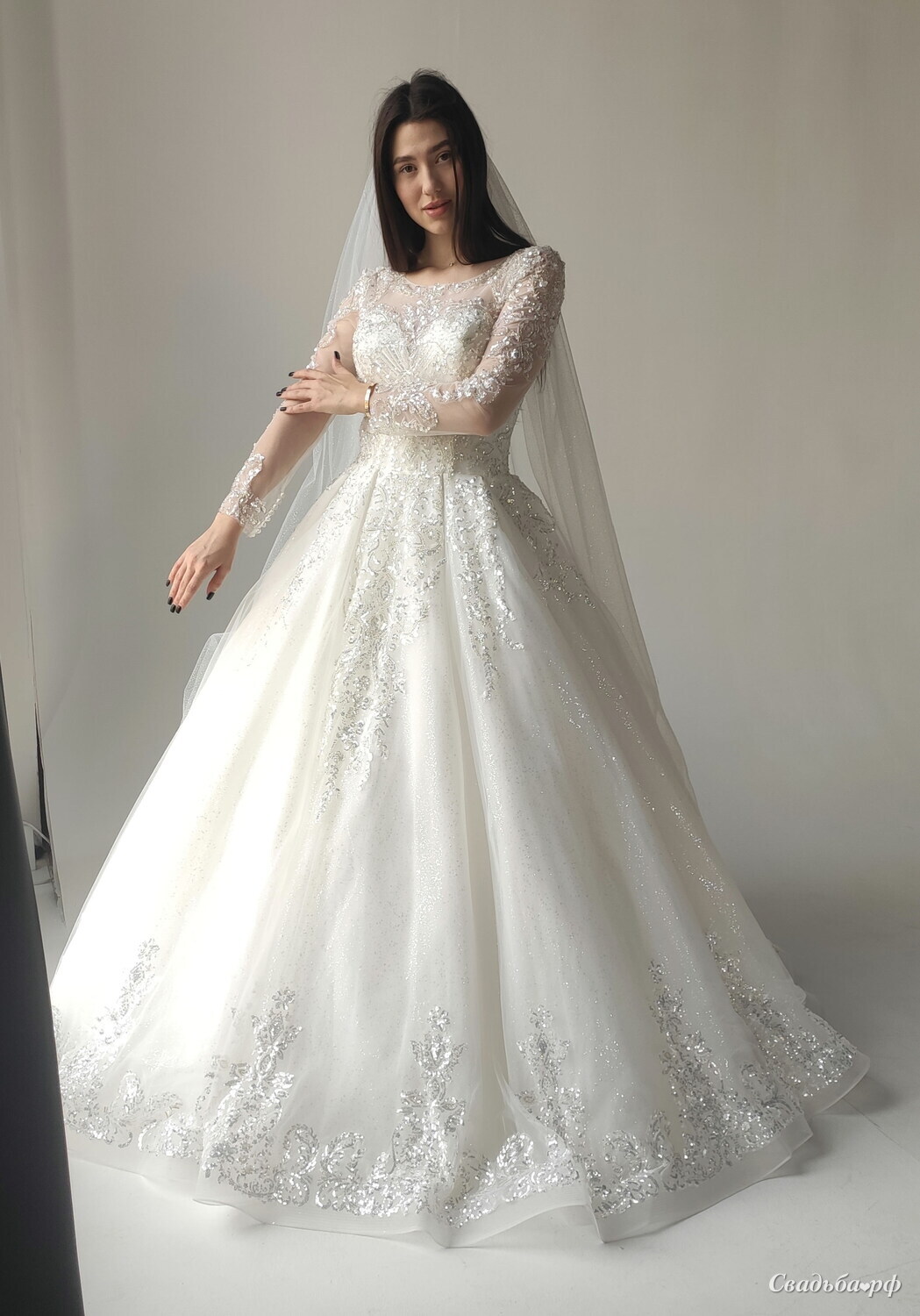 Закрытое свадебное платье с пышной юбкой и длинными кружевными рукавами