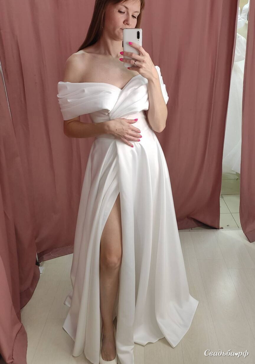 Шикарное атласное свадебное платье с разрезом по ножке и модными приспущенными плечами.